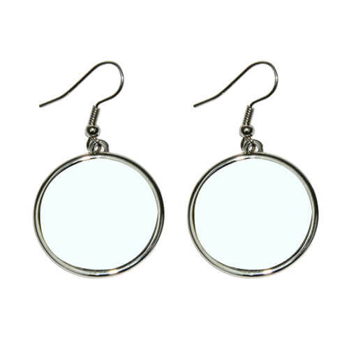 Cirkulære øreringe til sublimationstryk. Trykket er lavet på metalplader, der er fastgjort til øreringene, og som skal limes fast i de felter, der er fræset ind i øreringene.