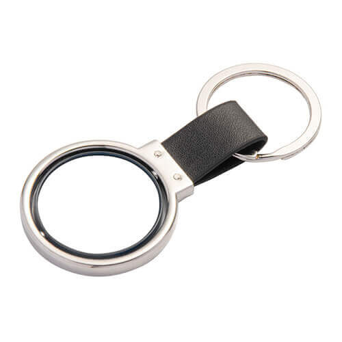 Roterende nøglering i læder og metal til sublimationstryk. Trykket udføres på to metalplader, der er fastgjort til nøgleringen, og som skal limes fast i et felt, der er fræset ind i nøgleringen. Nøgleringen er pakket i en dekorativ æske med en sort fløjlsindsats til at sætte nøgleringen fast i. Det færdige produkt er velegnet som en original gave osv.