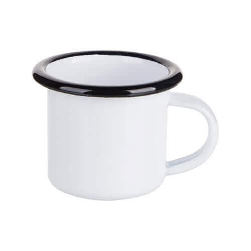 Metalbæger, emaljeret 100 ml til sublimationstryk. Hvidt krus med sort kant.