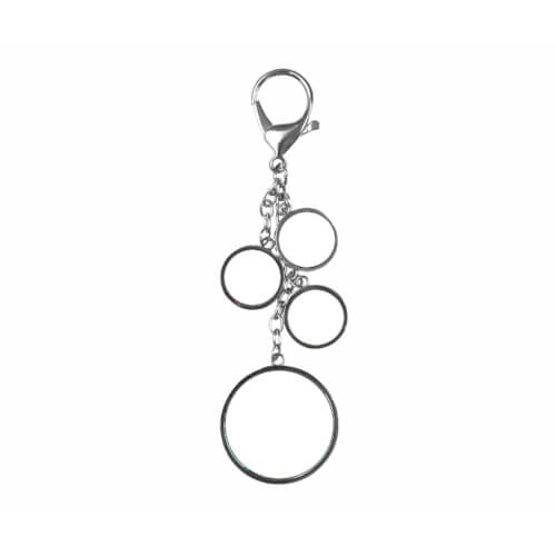 Zilveren metalen sleutelhanger met vier wieltjes voor sublimatiedruk aan twee zijden. Er wordt gedrukt op de metalen plaatjes die aan de sleutelhanger zijn bevestigd en die moeten worden vastgelijmd in de velden die in de sleutelhanger zijn gefreesd. De sleutelhanger is verpakt in een zwart decoratief doosje met een zwart imitatiefluwelen inzetstuk voor het bevestigen van de sleutelhanger. Het eindproduct is geschikt als origineel cadeau, enz.