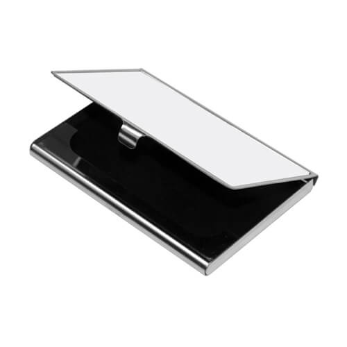 Elegáns fém névjegykártya doboz szublimációs nyomtatáshoz. Fekete velúrral bélelt doboz. A lenyomat a névjegykártya tartóhoz rögzített fémlemezre készül, amelyet a névjegykártya tartóban kialakított mezőbe ragasztanak.