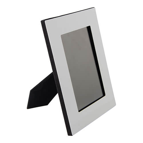 Álló fém fotókeret szublimációs nyomtatáshoz. Kemény farostlemezből készült vázszerkezet, fekete bársonnyal bevonva. A nyomtatás a keret alumínium előlapjára történik.