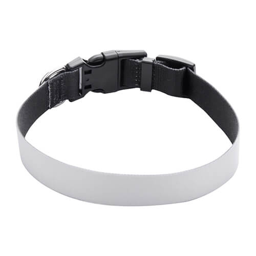 Kutyanyakörv szublimációs nyomtatáshoz. Állítható átmérőjű nyakörv, műanyag csattal rögzíthető, fémgyűrűvel a nyakpánt rögzítéséhez. A nyomtatás a gallér fehér részére történik.