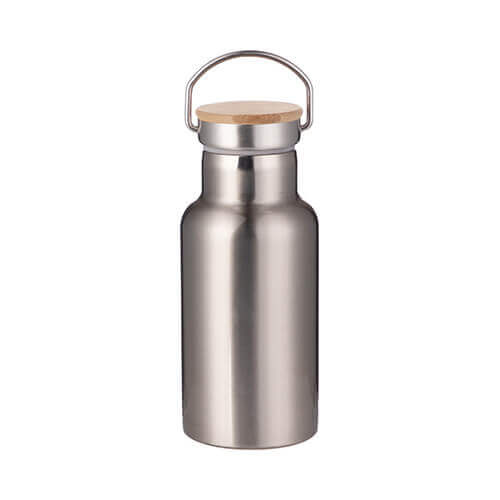 Rozsdamentes acél termosz 350 ml űrtartalommal, poliészterréteggel bevonva szublimációs nyomtatáshoz. Kupak fogantyúval, bambusz kivitelben.