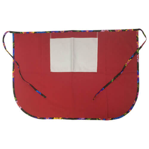 Konyhai kötény, derékban megkötve, piros színben, fehér zsebbel a szublimációs nyomtatáshoz.