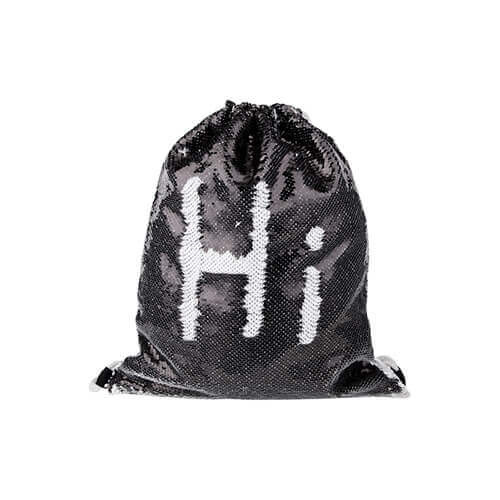 Hátsó tasak szublimációs nyomtatáshoz. A táska egyik oldala fehér poliészterből készült, a másik oldala kéttónusú flitterekkel borított. A nyomtatás a fehér poliészter oldalra és a flitteres oldalra is történhet. Húzózsinóros táska.