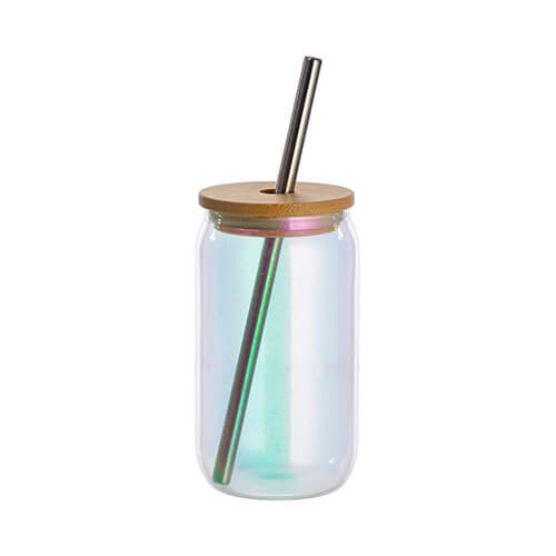 Irizáló üveg fém szívószállal és bambusz fedéllel.