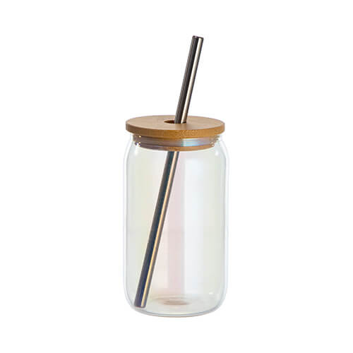 Irizáló üveg fém szívószállal és bambusz fedéllel.