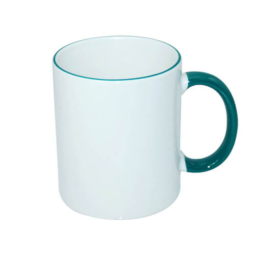 Bijela keramička šalica sa zelenom ručkom, klasa A+ /pogledajte što ovu klasu čini drugačijom od drugih/ obložena slojem poliestera za sublimacijski tisak.