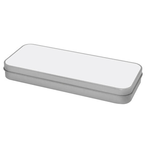 Metalna kutija/pernica za sublimacijski tisak. Otisak se izrađuje na priloženoj metalnoj pločici koja se lijepi na poklopac kutije.
