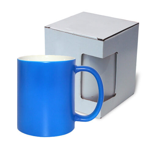Fluo boja - plava, mat, premazana slojem poliestera za sublimacijski tisak. Šalica s kartonskom kutijom. Dostupna u pojedinačnim količinama.