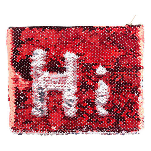 Kozmetička torbica za sublimacijski tisak. Otisci se mogu nanositi na bijelu poliestersku stranu ili stranu sa šljokicama. Torbica se zatvara patentnim zatvaračem.