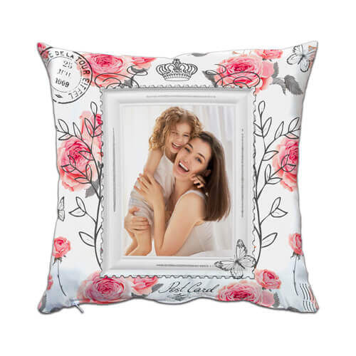 Dvobojna jastučnica s uzorkom "Razglednica" i okvirom za sublimacijski tisak. Jastučnica s patentnim zatvaračem.