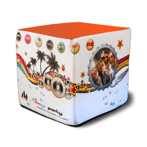 Dvobojna satenska navlaka za kvadratni puf s uzorkom "Sunce" i okvirom za sublimacijski tisak. Navlaka ima patentni zatvarač. Preporučujemo korištenje namjenskih punjenja za pufe s navlakama.