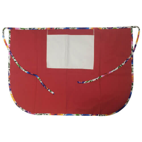 Klasična kuhinjska pregača s džepom za print - crvena sa šarenim rubom - bijelo slavensko cvijeće