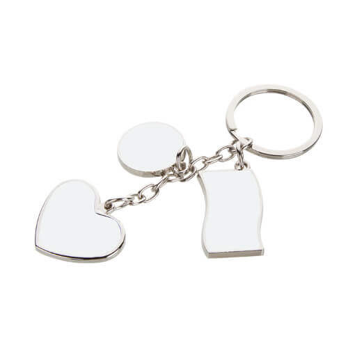 Metalni privjesak za ključeve za sublimacijski tisak. Ovaj privjesak za ključeve ima tri privjeska u obliku srca, kruga i zastave. Otisak je napravljen na priloženoj metalnoj pločici koja se lijepi na izrezano područje privjeska. Privjesak za ključeve pakiran je u ukrasnu kutiju s crnim umetkom s efektom baršuna za pričvršćivanje privjeska. Gotov proizvod može biti originalan poklon itd.
