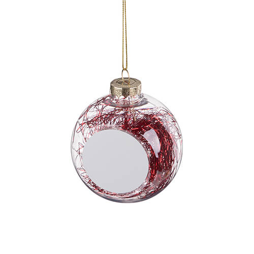 Božićna kugla za sublimacijski tisak. Otisak se izrađuje na priloženoj metalnoj pločici koja se lijepi na pripremljeno mjesto na kugli.