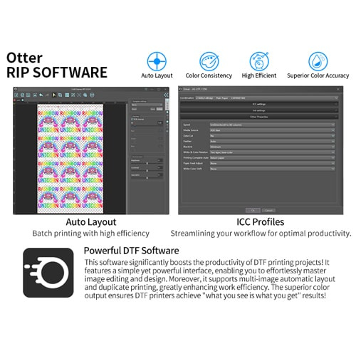 Uključuje Otter RIP softver. Ovaj softver značajno povećava produktivnost vaših DTF projekata ispisa! Njegovo jednostavno, ali moćno sučelje omogućuje vam da bez napora savladate uređivanje i dizajn slika. Nadalje, podržava automatski raspored više slika i duplicirani ispis, značajno povećavajući učinkovitost tijeka rada. Vrhunski ispis u boji osigurava da DTF pisači isporučuju "ono što vidite je ono što dobijete".