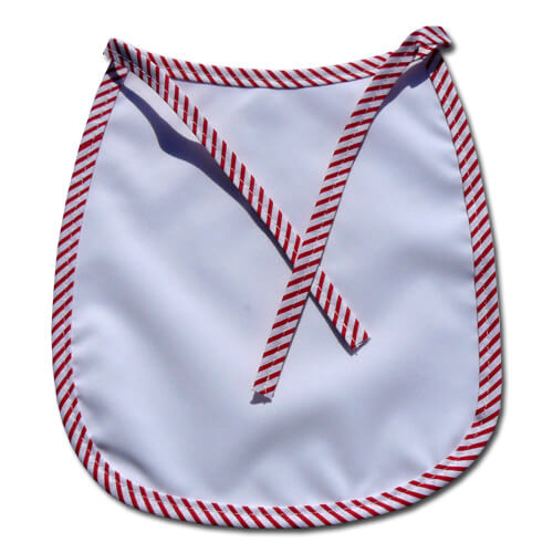 Bijeli vrhunski dječji podbradnik s crvenim prugastim obrubom za sublimacijski tisak.