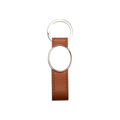 Krúžok na kľúče na sublimačnú tlač. Hnedý kožený prívesok na kľúče s kovovým prvkom. Potlač sa zhotovuje na kovovej doštičke pripevnenej ku kľúčenke, ktorú je potrebné vlepiť do poľa vyfrézovaného do kľúčenky. Kľúčenka je zabalená v čiernej ozdobnej škatuľke s čiernou zamatovou vložkou na upevnenie kľúčenky. Hotový výrobok je vhodný ako originálny darček a pod.